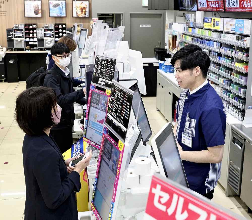 A convenience store employee serves customers at a register where plastic sheets to prevent airborne droplets have been removed in Shinagawa Ward, Tokyo, on Monday.