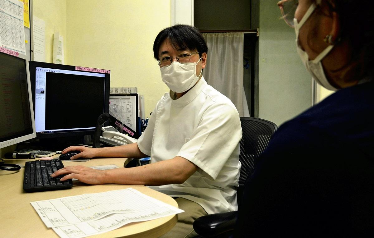 Koichi Hirahata, director of Hirahata Clinic, speaks with a long-COVID patient in Shibuya Ward, Tokyo, on May 2.