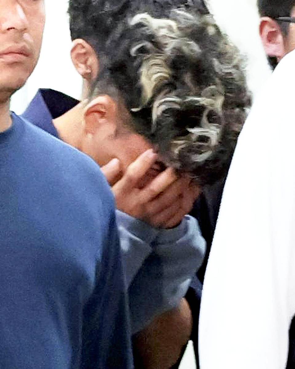 Masashi Tanimoto is seen covering his face with his hands when he arrived at Shin-Kobe Station on Friday night.