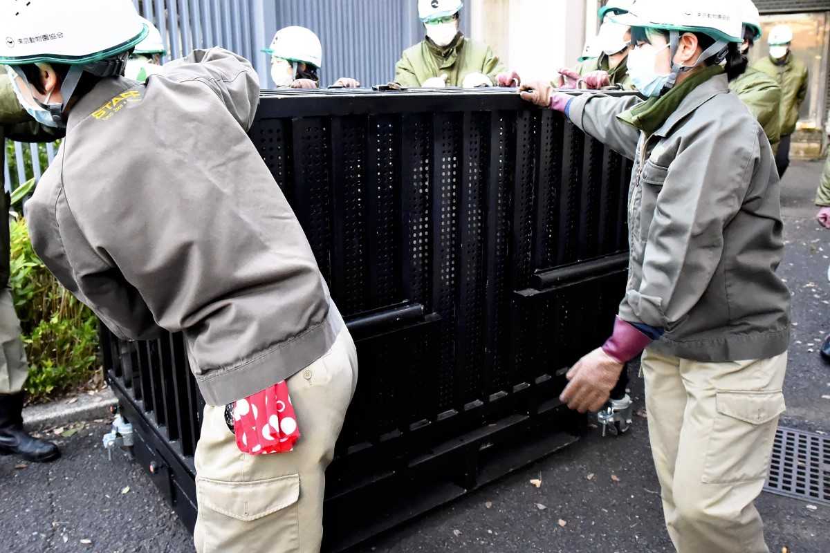 Ueno Zoo staff carry the cage with Xiang Xiang inside on Tuesday.