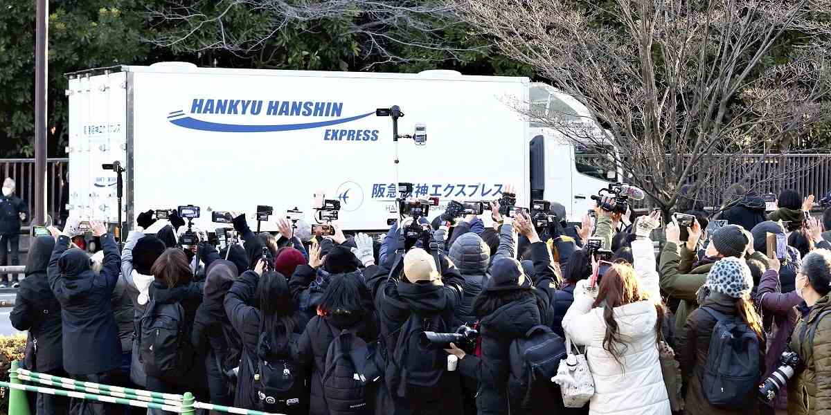 A truck carrying Xiang Xiang leaves Ueno Zoo on Tuesday morning in Taito Ward, Tokyo.