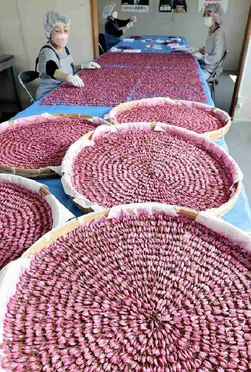 Production has hit high season for a group of residents making salted cherry blossom petals in Unnan, Shimane Prefecture, which is known for its cherry blossoms.