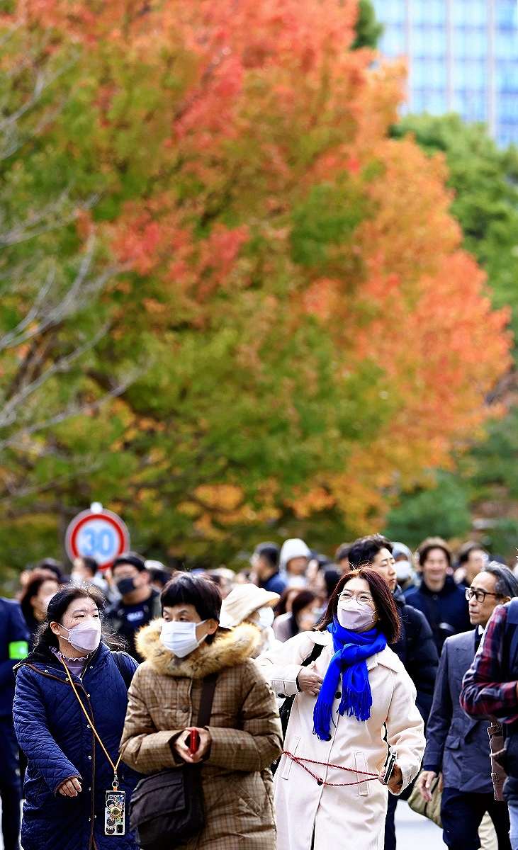 Seventy momiji Japanese maple trees with colorful leaves line the 750-meter-long street. The minimum temperature in central Tokyo was 8.4 C, much colder than the day before. Some people walked around the grounds wearing coats and scarves. The street will be open to the public until Dec. 3.