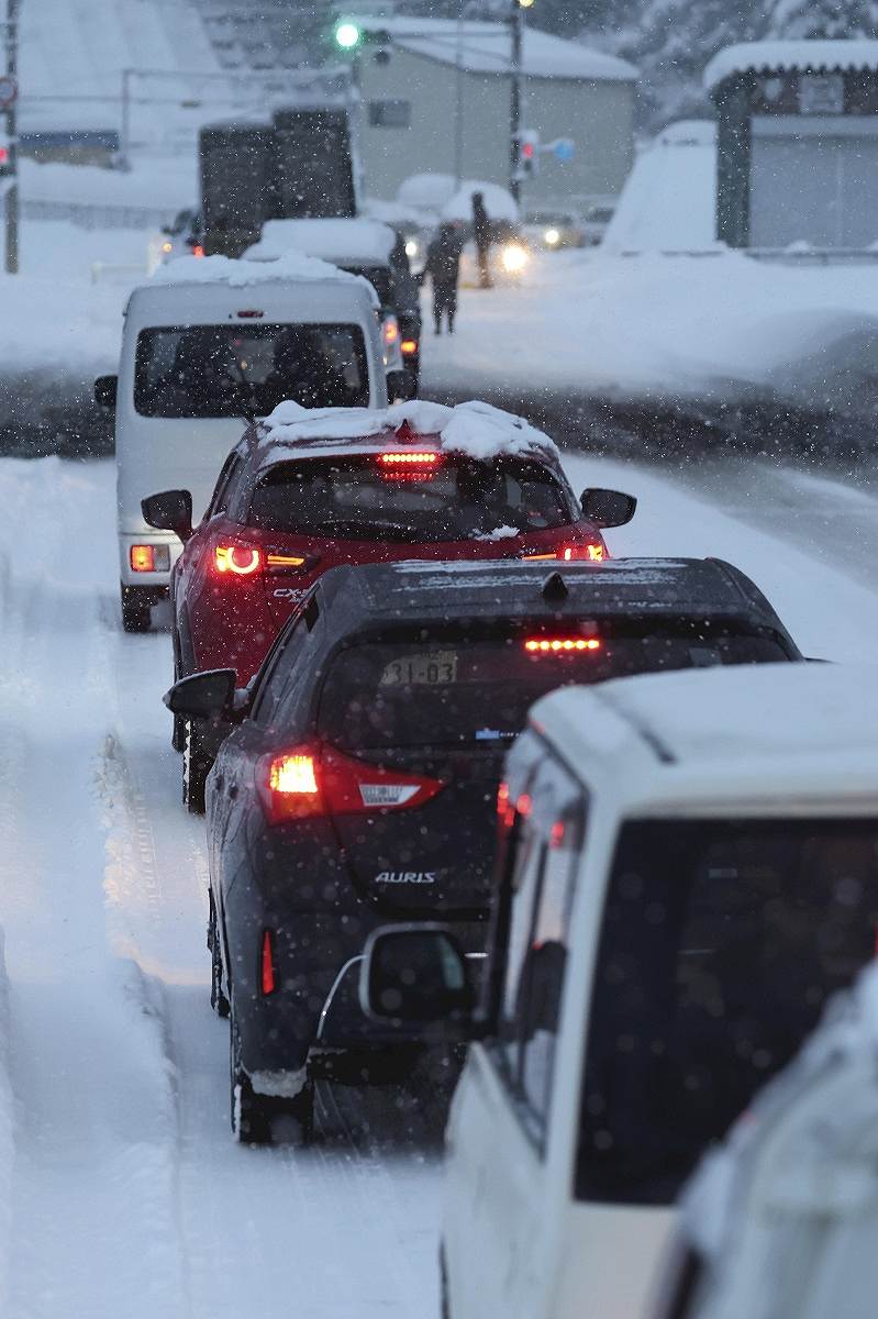 Cars are stuck in traffic due to heavy snowfall in Sekigahara, Gifu Prefecture, on Wednesday evening.