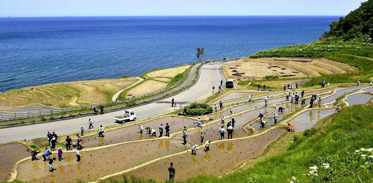 WAJIMA, Ishikawa — Rice planting kicked off at the Shiroyone Senmaida rice terraces in Wajima, Ishikawa Prefecture, on Saturday.