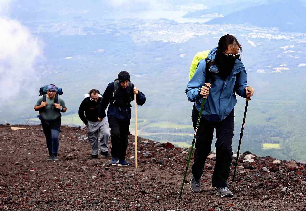 Climbers walk toward a mountain cottage for the early-morning sunshine on Mt. Fuji on the Yamanashi side on June 30, 2023.