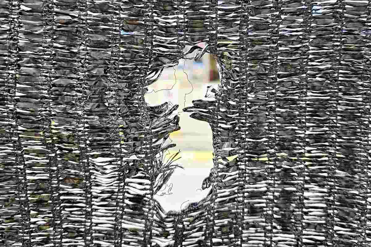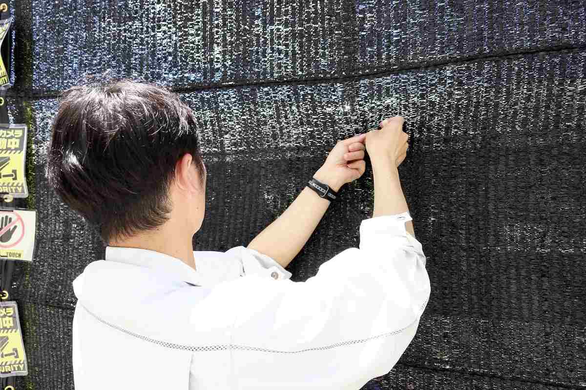 A black mesh screen is seen with a rip that appeared to be intentionally torn in Fuji-Kawaguchiko, Yamanashi Prefecture, on Saturday.