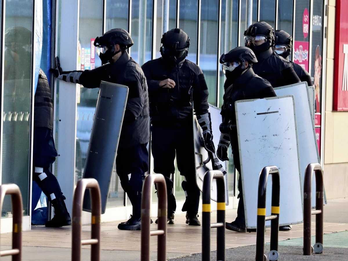 Left: Police officers enter the Itoku Tsuchizaki Minato supermarket to check whether a bear was trapped in a box in Akita on Monday morning.