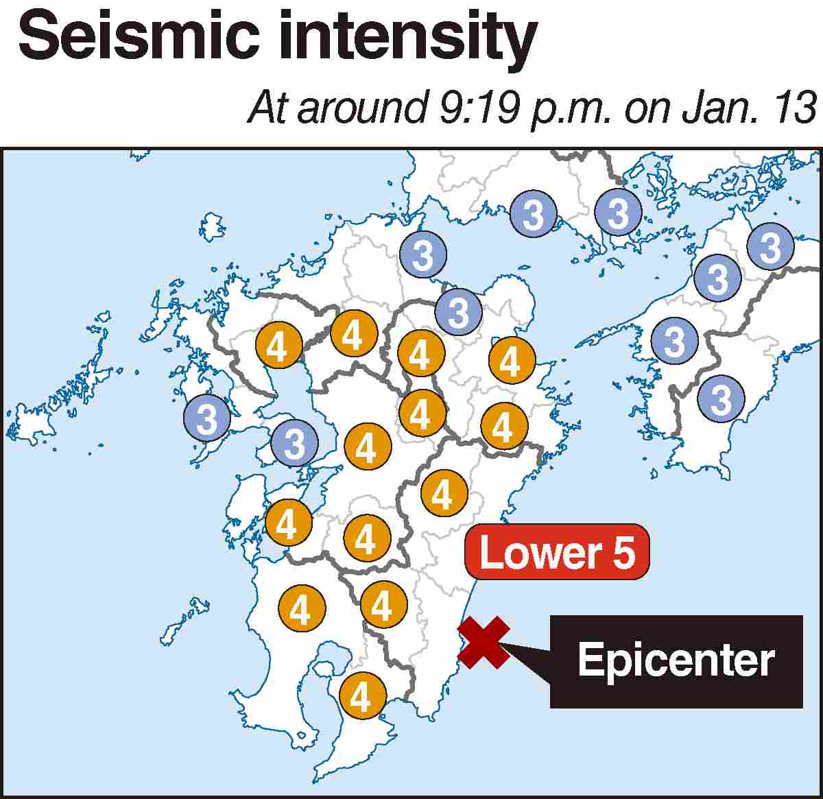 Miyazaki, Takanabe and Shintomi in the prefecture saw an intensity of lower 5. The magnitude was 6.9 and the focus was at a depth of about 30 kilometers off the prefecture.