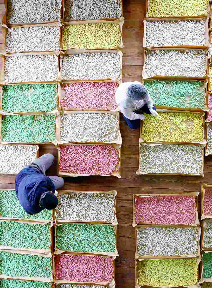 A couple dries colorful mochi, part of the process of making Noto Shika Arare bite-size rice crackers, in Shika, Ishikawa Prefecture. Kunio Shirayama, 81, and his wife, Fusako, 82, cut the mochi into 1-centimeter cubes and dry them in wooden boxes, stirring them up once every three days. After about six weeks, when it is dry, the mochi is baked.