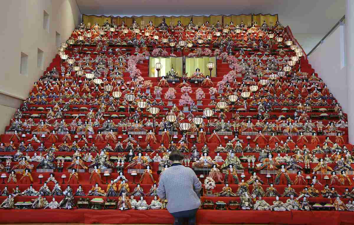 About 600 hina dolls are gorgeously displayed on a 30-tiered platform at The World Folk Doll Museum in Suzaka, Nagano Prefecture.