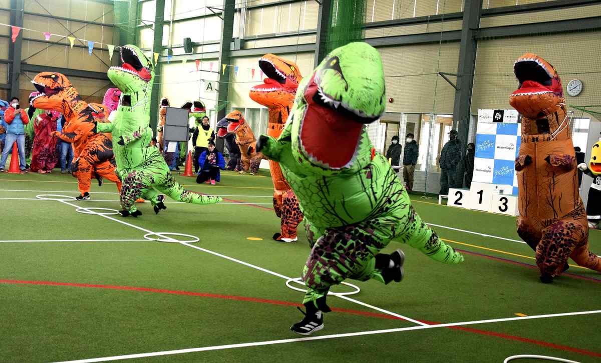 KITAKAMI, Iwate — A colorful array of Tyrannosaurus rexes — technically speaking, kids and adults in dinosaur costumes — raced against each other in Kitakami, Iwate Prefecture, recently in an event held to promote the joy of running.