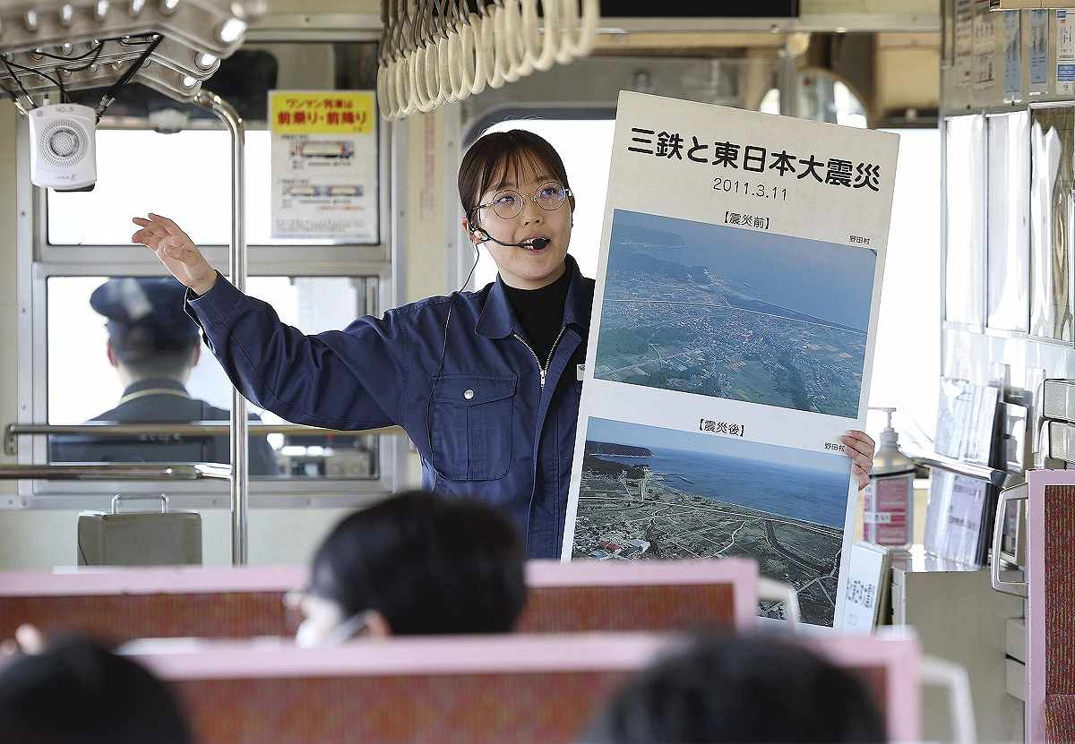 MIYAKO, Iwate Pref. — A woman who experienced the Great East Japan Earthquake as a child is now working for a local railway company, serving as a guide for train tours where passengers can learn about disaster preparation.