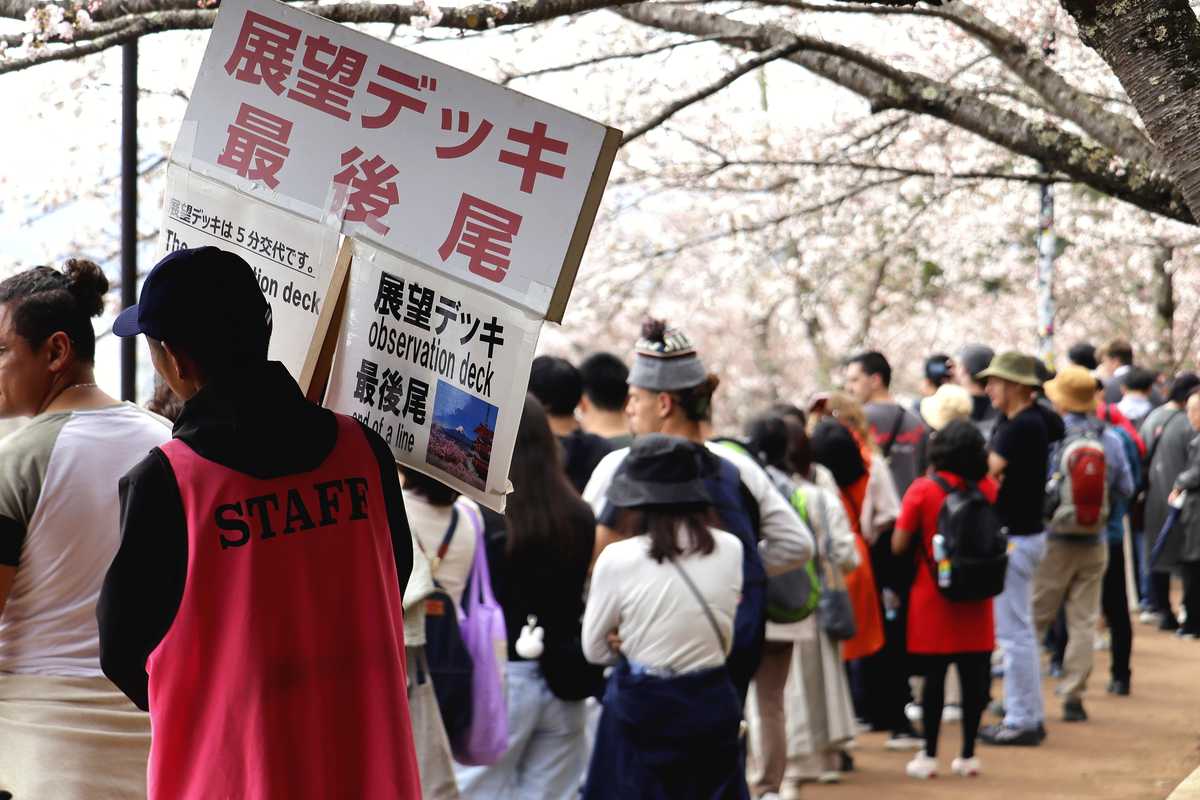 People line up for the observation deck of Arakurayama Sengen Park in Fujiyoshida, Yamanashi Prefecture, on April 11.