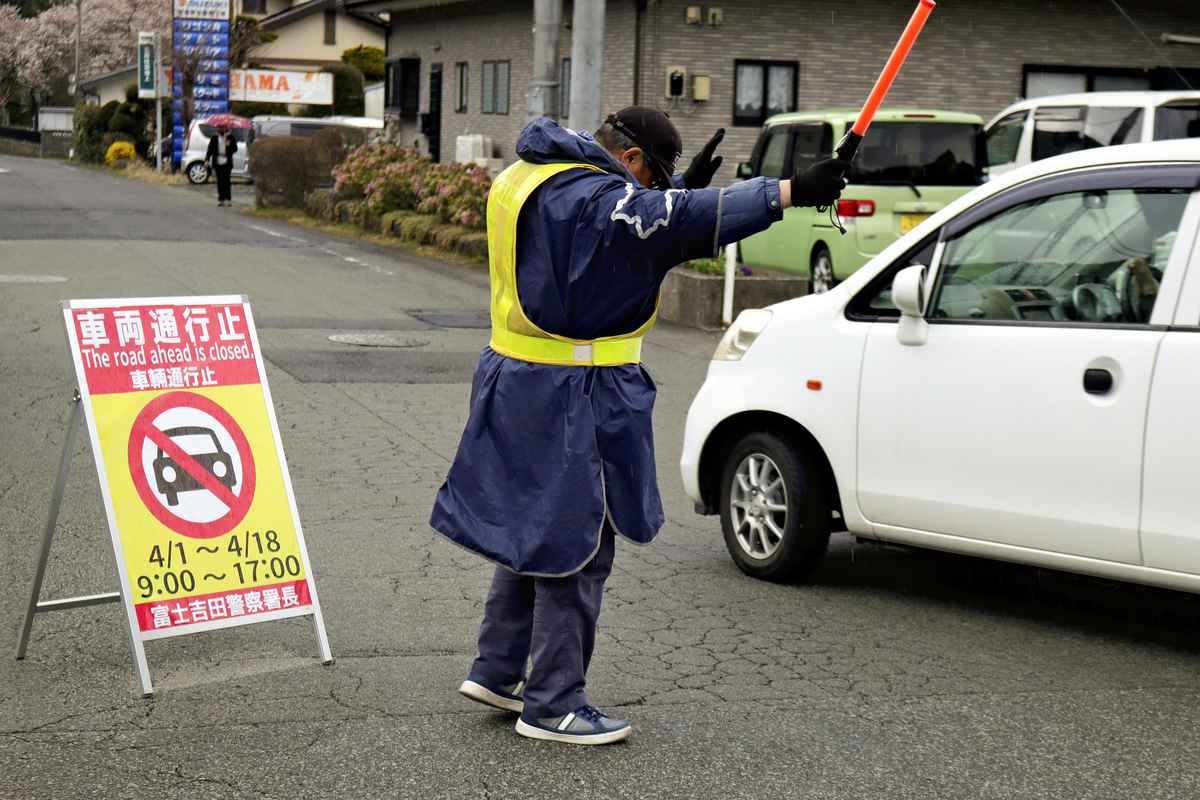 A security guard asks a driver to wait in Fujiyoshida, Yamanashi Prefecture, on April 11.