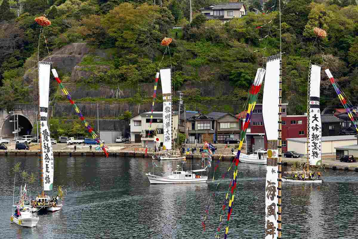 On the day of the festival, residents raised the flags on two small boats tied together before fishermen and children boarded. The pairs of boats were then pulled around the harbor and nearby waters by fishing boats, accompanied by the sounds of taiko drums and flutes.