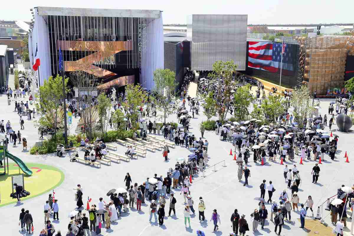 Visitors wait in long lines in front of the French pavilion, left, and the U.S. pavilion, center, at the 2025 Osaka-Kansai Expo in Konohana Ward, Osaka, on May 13.