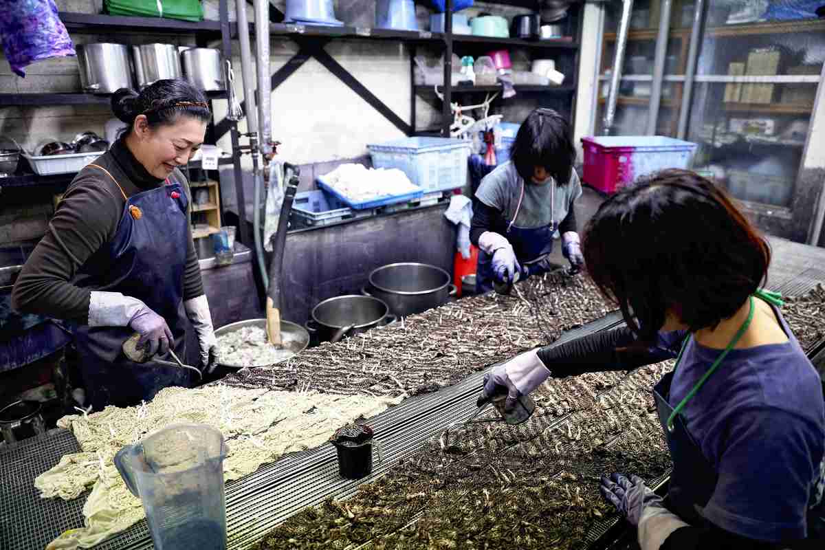 Amid this work, lively conversation that is audible over the sounds of a dryer rings through the workshop. Maki Takaesu, 54; Yayoi Uchida, 52; and Kaori Masuda, 48, chat happily as they deftly work in perfect harmony. They appear just like three sisters.