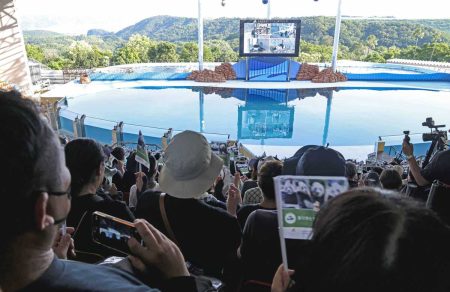 A ceremony to bid farewell to the pandas is held at Adventure World on Friday.