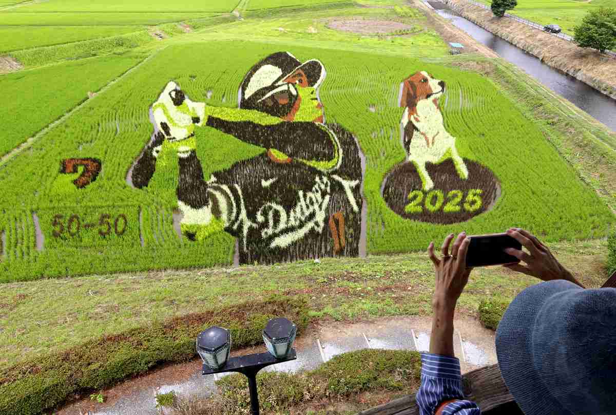 Rice paddy art depicting Los Angeles Dodgers star Shohei Ohtani and his dog Dekopin, also known as Decoy, can be seen in his hometown of Oshu, Iwate Prefecture.