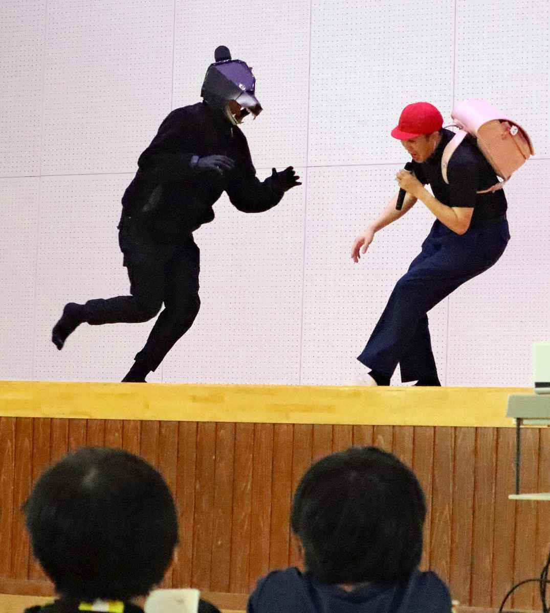 Police officers perform a skit about how to escape a bear at Higashiyama Elementary School in Ichinoseki, Iwate Prefecture, on Thursday.