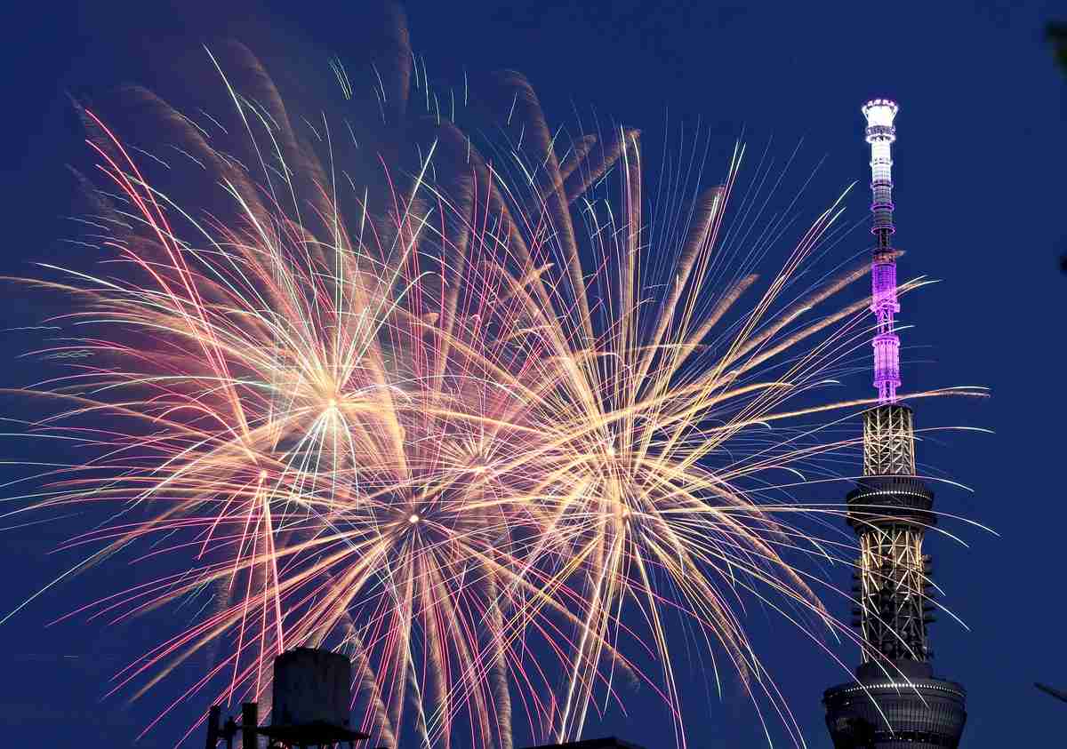 Fireworks go off near the Tokyo Skytree in Sumida Ward, Tokyo, on Saturday.