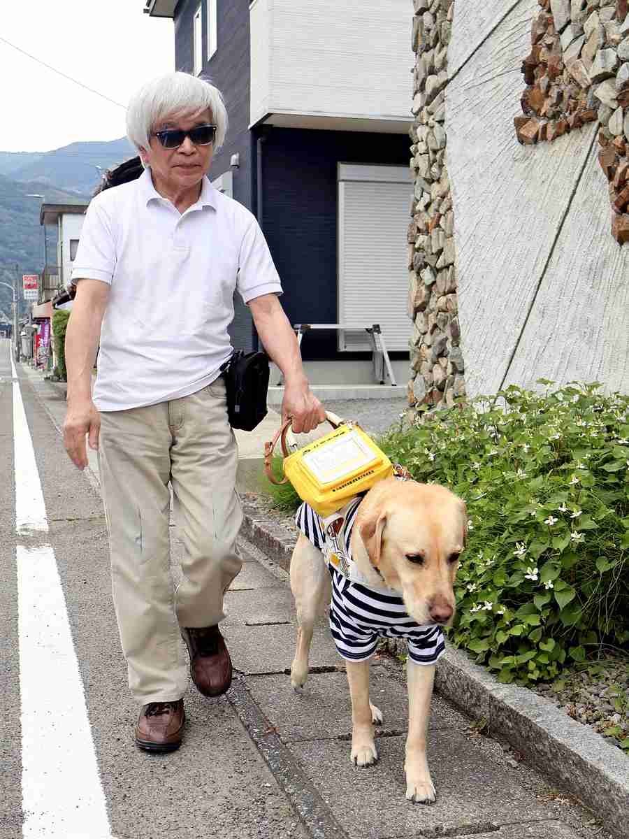 Kenichi Mukai walks with his guide dog Evan in Miyoshi, Tokushima Prefecture.