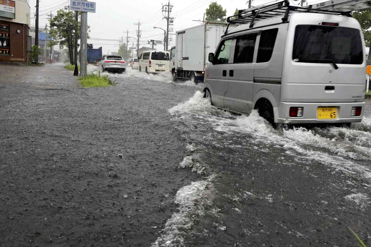 In Kanazawa, the Daitokugawa river overflowed, causing flooding of roads and other areas.