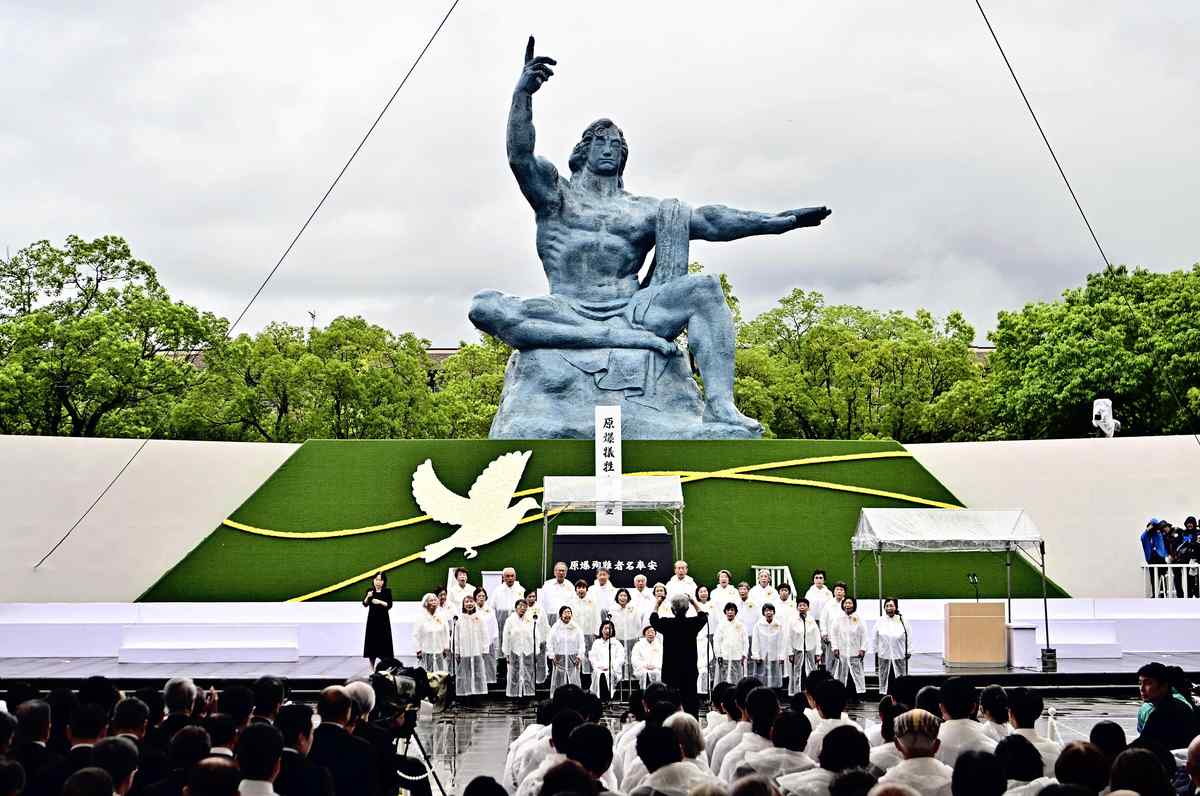 Members of a choir sing at the Nagasaki Peace Park prior to the Nagasaki Peace Memorial Ceremony in Nagasaki on Saturday.