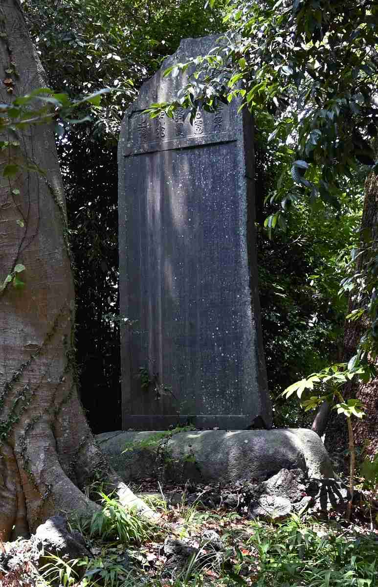 A monument that tells of the construction of the torii gate and park at Miho Shrine with donations from emigrants