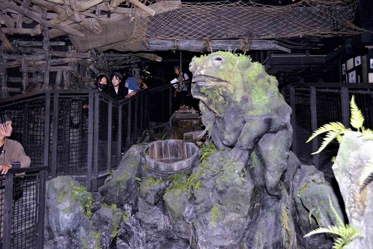 The four-story building features an atrium spanning the first to third floors. The dark, cave-like interior evokes an atmosphere of secret ninja operations. It has a suspension bridge and eye-catching statues of a large frog and a snake. Visitors navigate narrow passages — just wide enough for one person — relying on lantern light as they traverse the massive obstacle course.