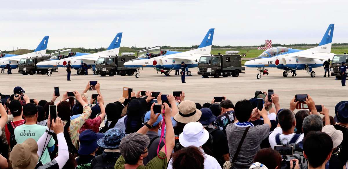 HIGASHI-MATSUSHIMA, Miyagi — The Blue Impulse aerobatic demonstration team thrilled over 40,000 people with precision and skill in an air show at their home base at the Air Self-Defense Force’s Matsushima Base in Higashi-Matsushima, Miyagi Prefecture, on Sunday