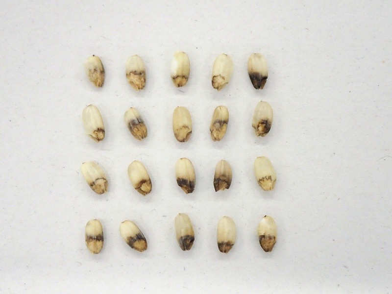 Spots caused by stink bugs are seen on rice grains.