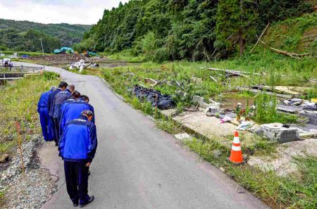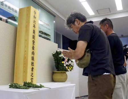 At 9:30 a.m., about 15 residents observed a moment of silence at the community center in Otanimachi in Suzu, where heavy rainfall left districts temporarily cut off and claimed one life.