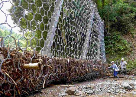 Left: This photo taken on Sept. 13 shows a temporary dam in Wajima that prevented damage to downstream areas during heavy rains in early August. Right: This photo taken on Sept. 11 shows a fence with driftwood and sediment from the heavy rains tangled up in it.
