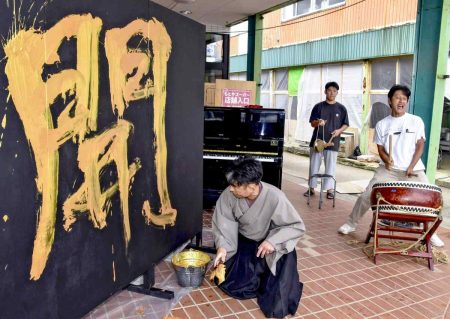 Elsewhere in the city on the same day, calligrapher Hoju Abe, 46, wrote a kanji character at a supermarket that suffered flood damage in the rains. The character expressed his condolences and determination to rebuild.
