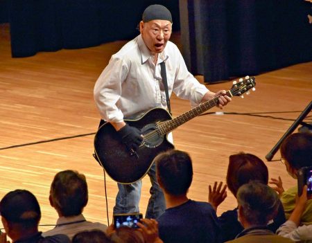 Singer Shigeru Izumiya, 77, visited Suzu on Sunday and gave a free live performance, which had been planned for a year earlier but was canceled due to the rains. He played the guitar and sang five songs, telling the about 500 audience members, “My mission is to energize you all.”