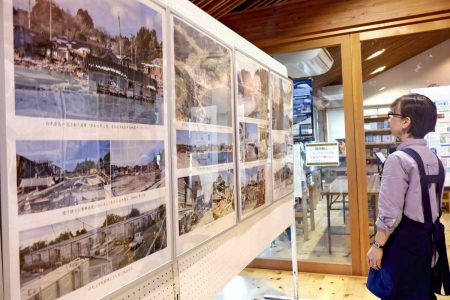 Left: Calligrapher Hoju Abe displays his work at a supermarket in Wajima on Sunday. Right:An exhibition of photos showing areas devastated by the earthquake and heavy rains is held in Noto, Ishikawa Prefecture, on Friday.