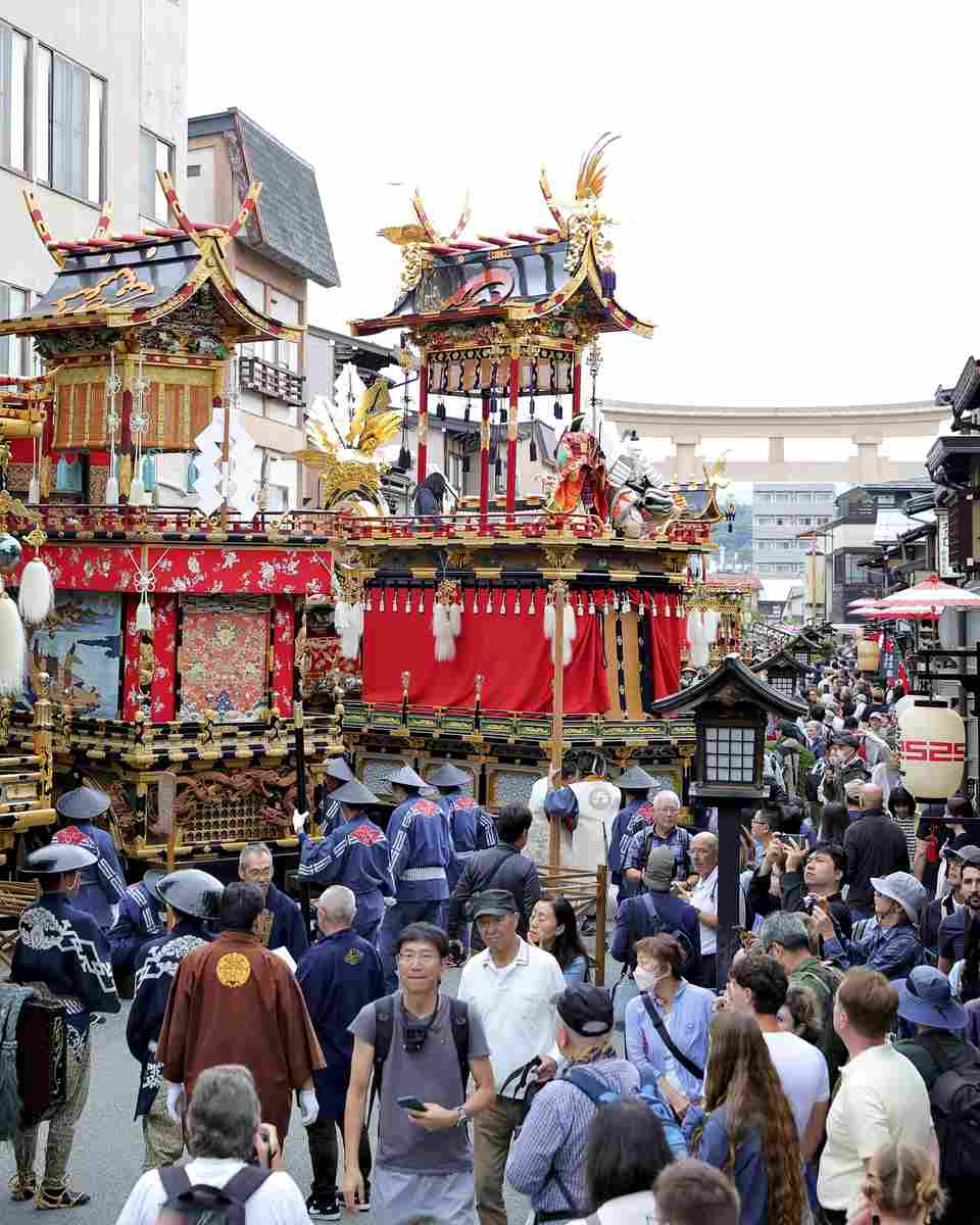 Beautifully decorated floats lined the approach to Sakurayama Hachimangu shrine during the Takayama Autumn Festival in Takayama, Gifu Prefecture, on Thursday.