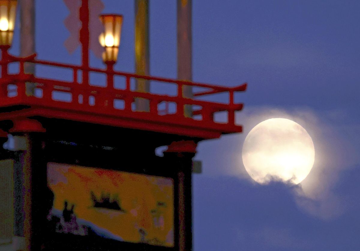 In Noto, Ishikawa Prefecture, appearing from a break in the clouds, the supermoon was seen from a location near the Furusato Kiriko Bridge, a structure modeled after giant kiriko lanterns used in traditional events.