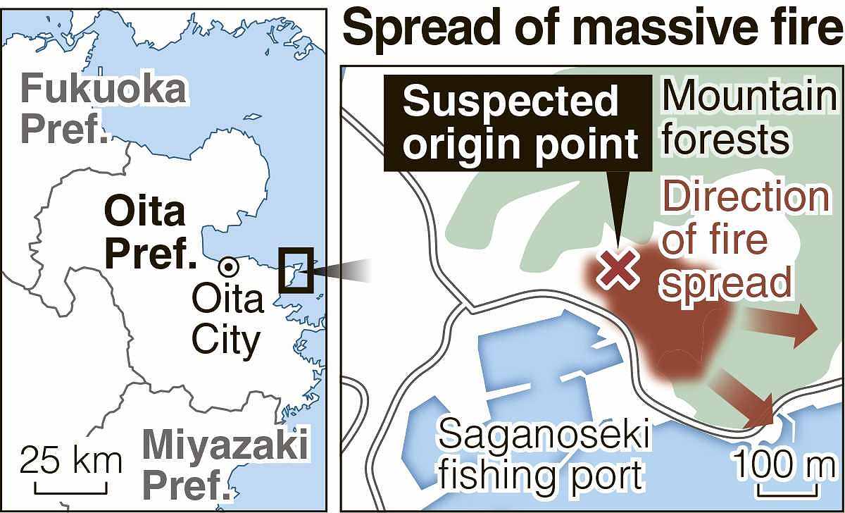 OITA — A massive fire that broke out in the Saganoseki district of Oita City on Tuesday, may have started in the northwestern part of the burned area, according to the city fire department.