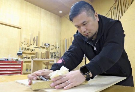 Fukutaro Azuma planes paulownia lumber at his company’s workshop in Kinokawa, Wakayama Prefecture.
