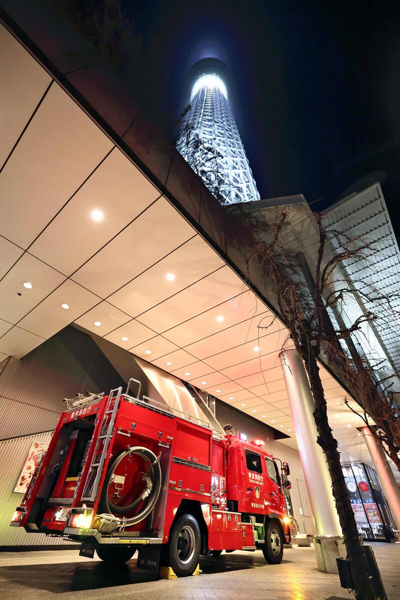 A fire engine is seen in front of Tokyo Skytree, where an elevator came to an emergency stop, in Sumida Ward, Tokyo, on Sunday.