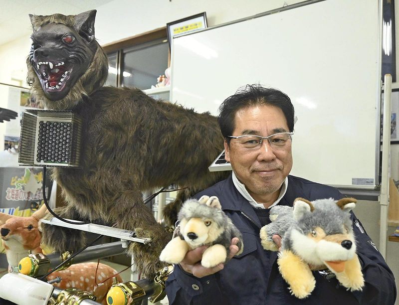NAIE, Hokkaido — A metalworking company in Naie, Hokkaido, has developed a portable stuffed wolf that helps drive away bears and other wild animals with lights and sound. The firm hopes it will be used instead of bear repellent bells when fishing or walking in the mountains.