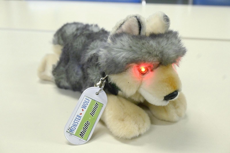 The Monster Wolf Mini is about 20 centimeters long. With a speaker installed, it blares sounds when it detects animals. It also flashes the lights in its eyes. The volume is adjustable and can be increased up to 80 decibels — equivalent to the volume of cicadas buzzing.