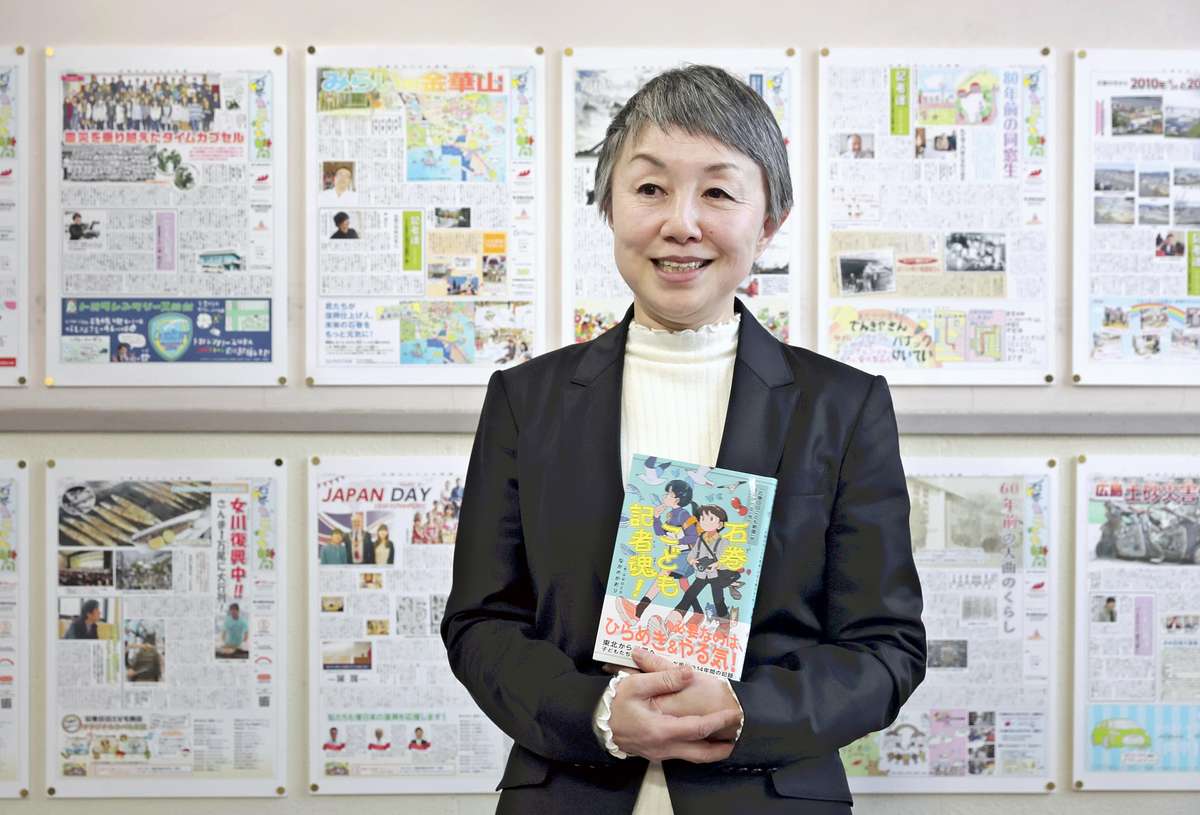 Michiko Ota, who oversees a children’s newspaper in Ishinomaki, Miyagi Prefecture, holds the book “Ishinomaki Kodomo Kisha Damashii!” (The spirit of Ishinomaki’s child reporters!)