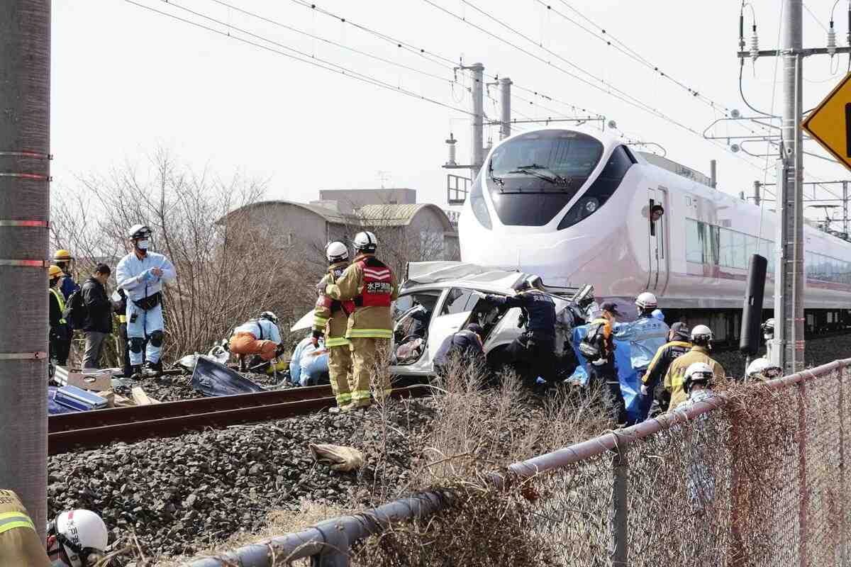 A destroyed car and an express train are seen after a collision on Friday in Mito.