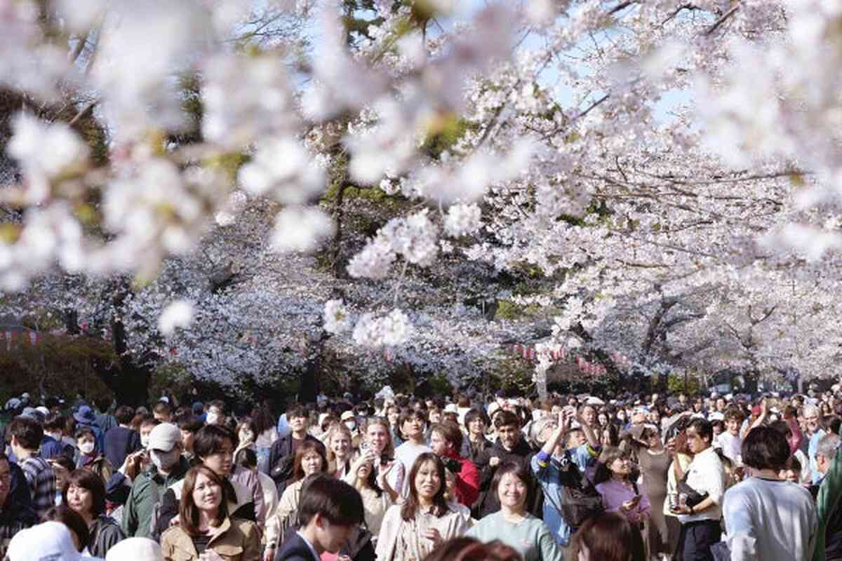 Cherry blossom viewers flock to Ueno Park on Saturday.