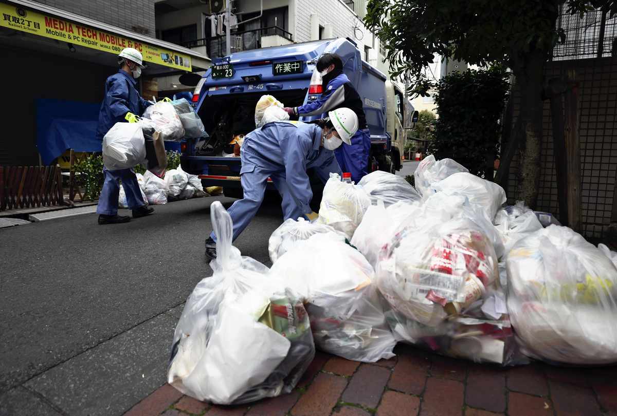 Workers collect garbage at a trash collection site in Shinjuku Ward, Tokyo, on March 17.