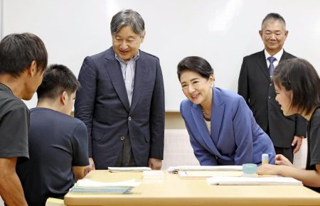 The Emperor and Empress met with junior and high school students on Monday at a prefectural schoo...